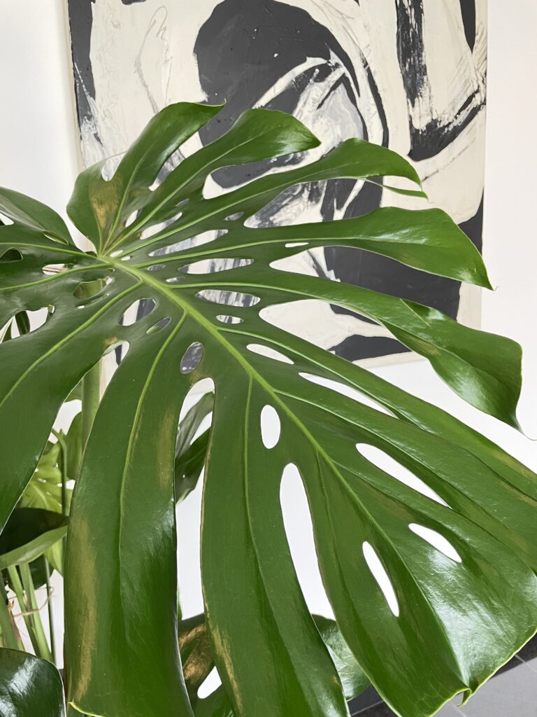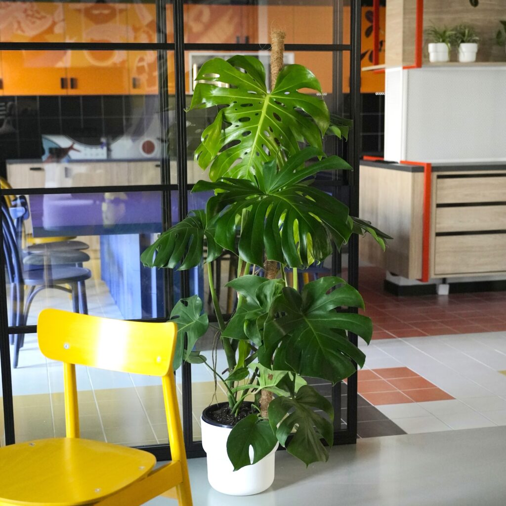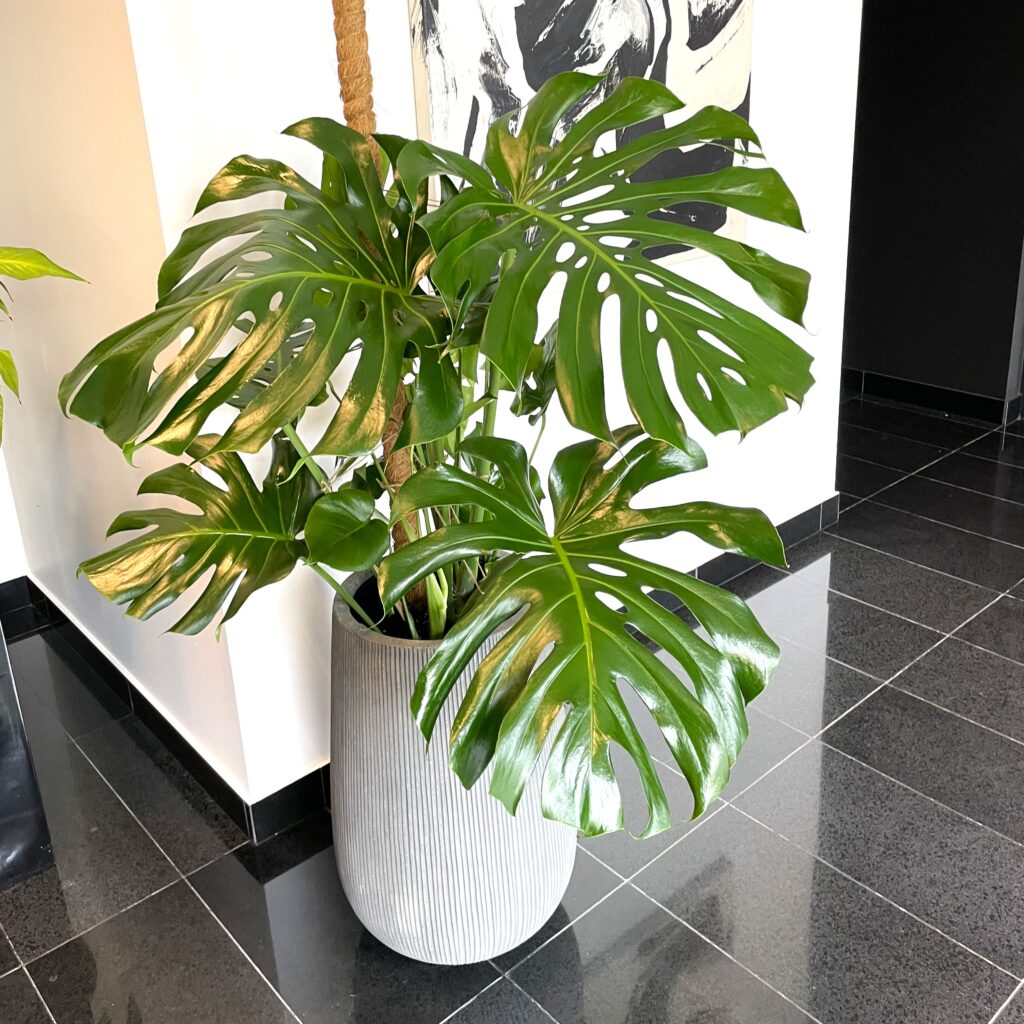 Monstera Big Form dzięki swoim ogromnym rozmiarom świetnie wypełnia przestrzeń,