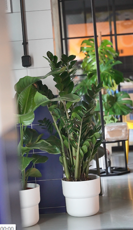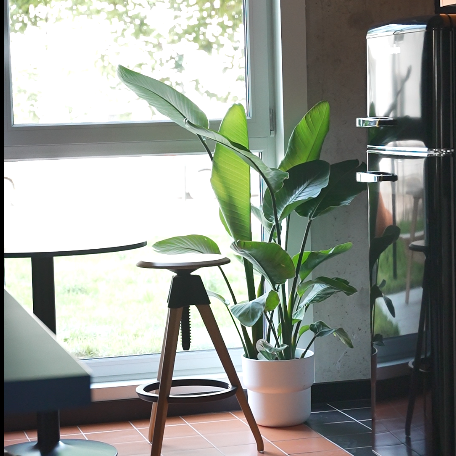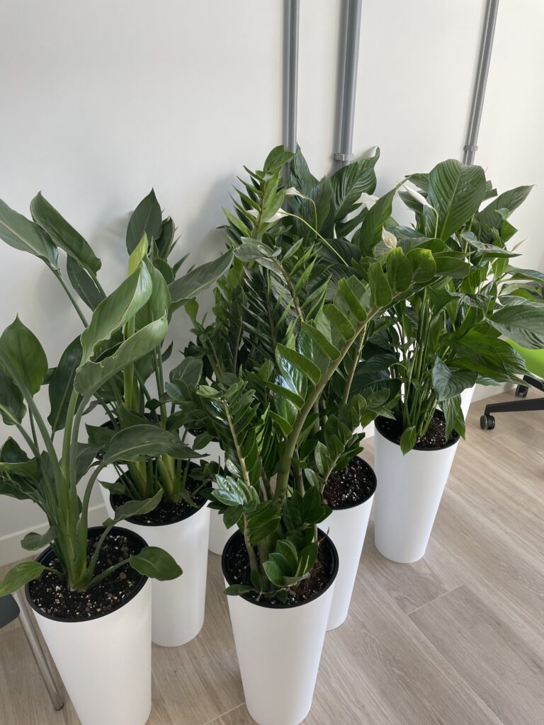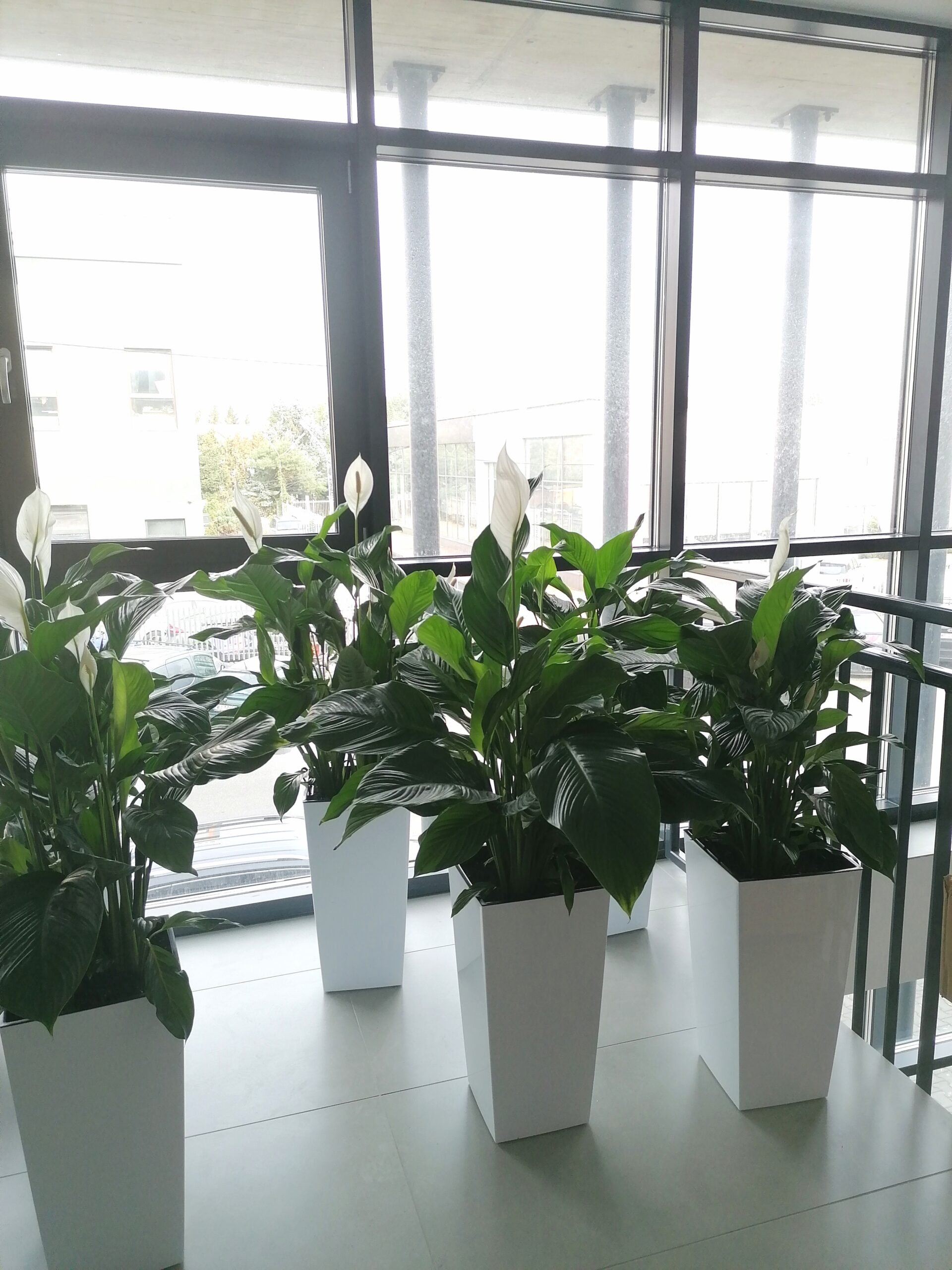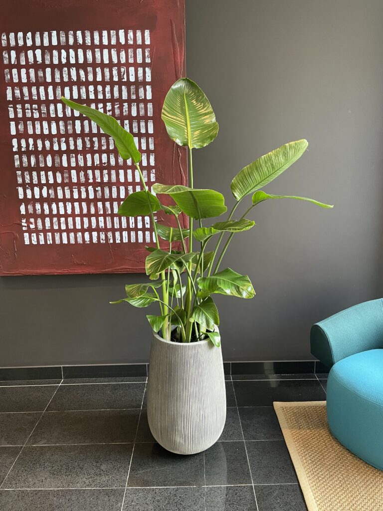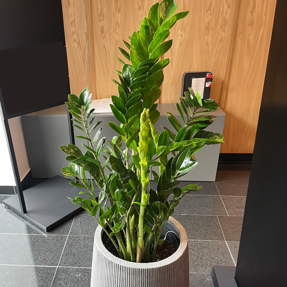 W wysokich donicach podłogowych posadziliśmy imponujące Skrzydłokwiaty Sensation (olbrzymie), które dzięki swoim rozmiarom doskonale zazieleniają duże przestrzenie i doskonale komponują się ze Strelicjami, które wnoszą do wnętrza egzotyczny charakter . Całość dopełniają odporne Zamiokulkasy, które wprowadzają elegancję łącząc głęboką zieleń z naturalnym połyskiem liści.