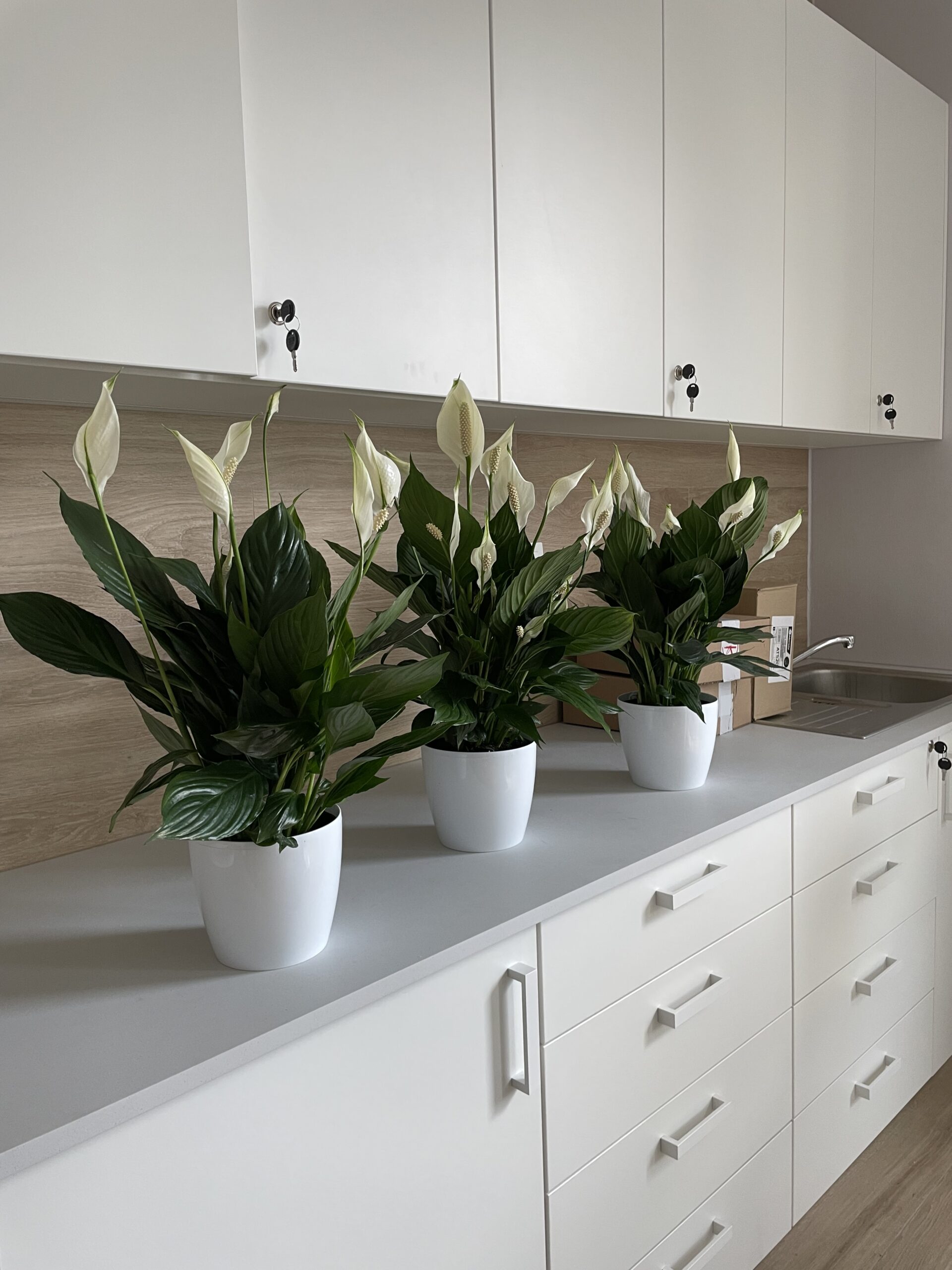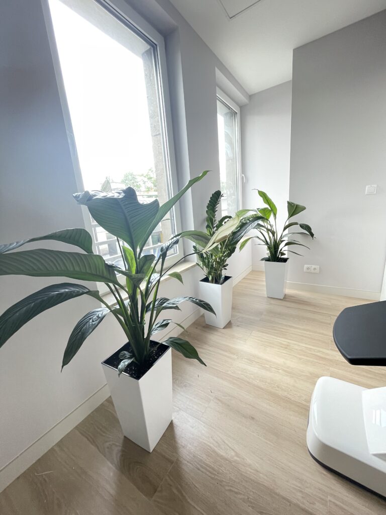 Drobniejszą odmianę Skrzydłokwiatów zastosowaliśmy w doniczkach na stolikach i parapetach. Połączenie jasnych donic z białymi kwiatami tworzy efekt świeżości i harmonii, idealnie wpisujący się w estetykę gabinetów medycznych.